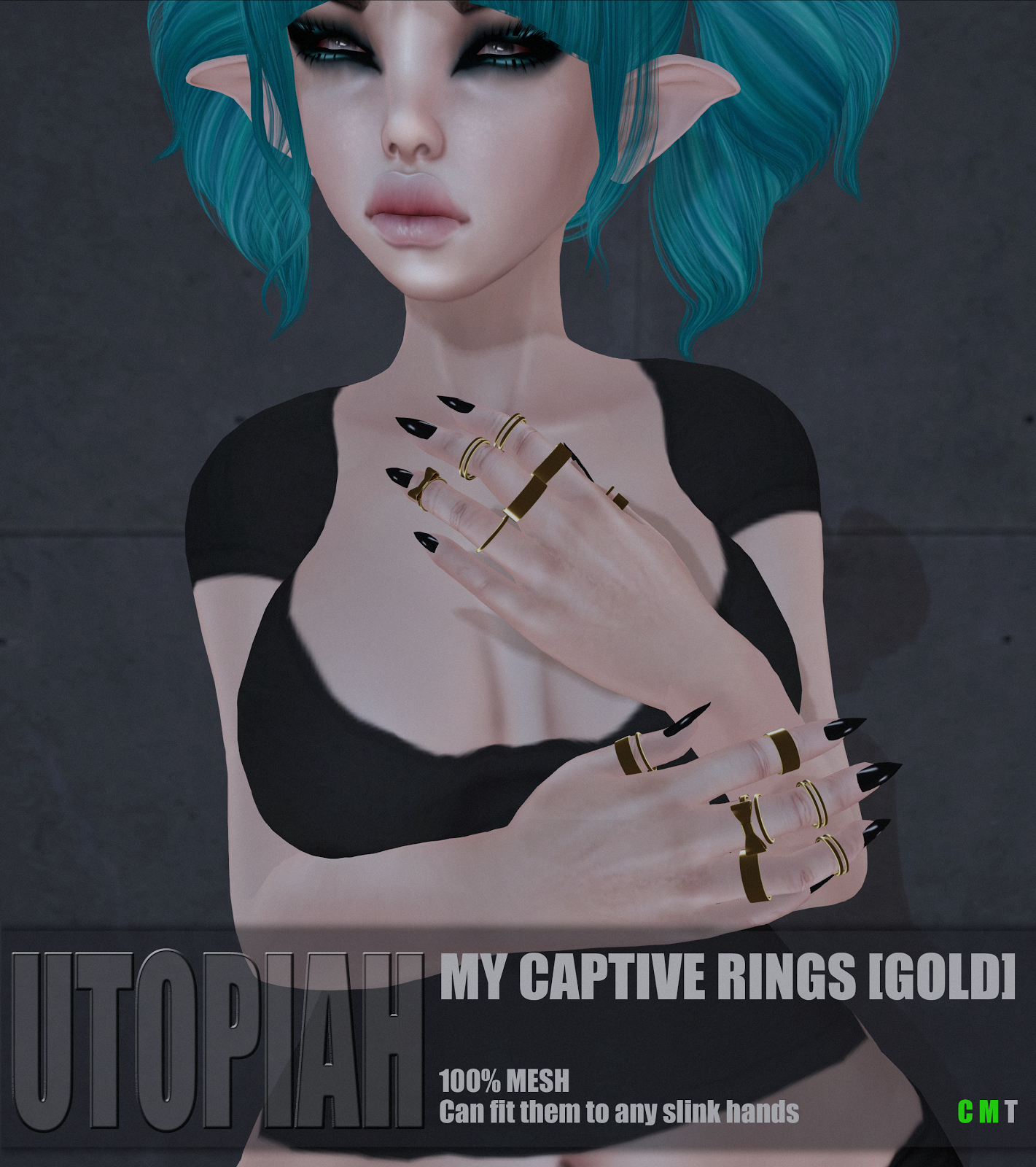 A lot of new for u!! "My captive mesh rings" wear these rings with slink hands you want (are 100% modifiable)! And finally a pair of socks, they are Cute/Phat Azz and slink compatible!! Hope u like and happy shopping!!